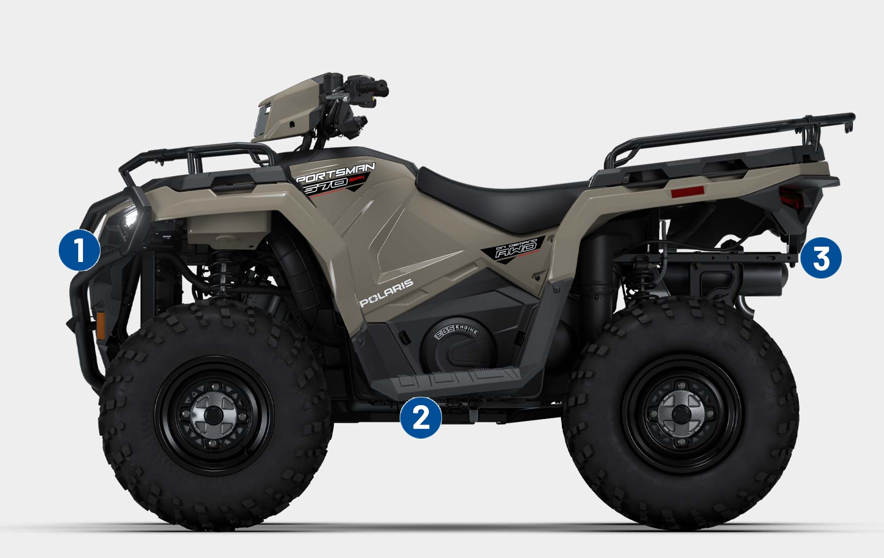 - Puerto de Carga de 12V, Puerto de Carga Lenta en Manillar, Precableado para Calentadores de Manos y Pulgares, Winch de 3,500 lb con Cuerda de Acero, Defensa Delantera Trail, Extensores de Parilla Delantero/Trasero, Plásticos Pintados, Resortes Pintados, Protectores de Brazo A de Suspensión Delantero