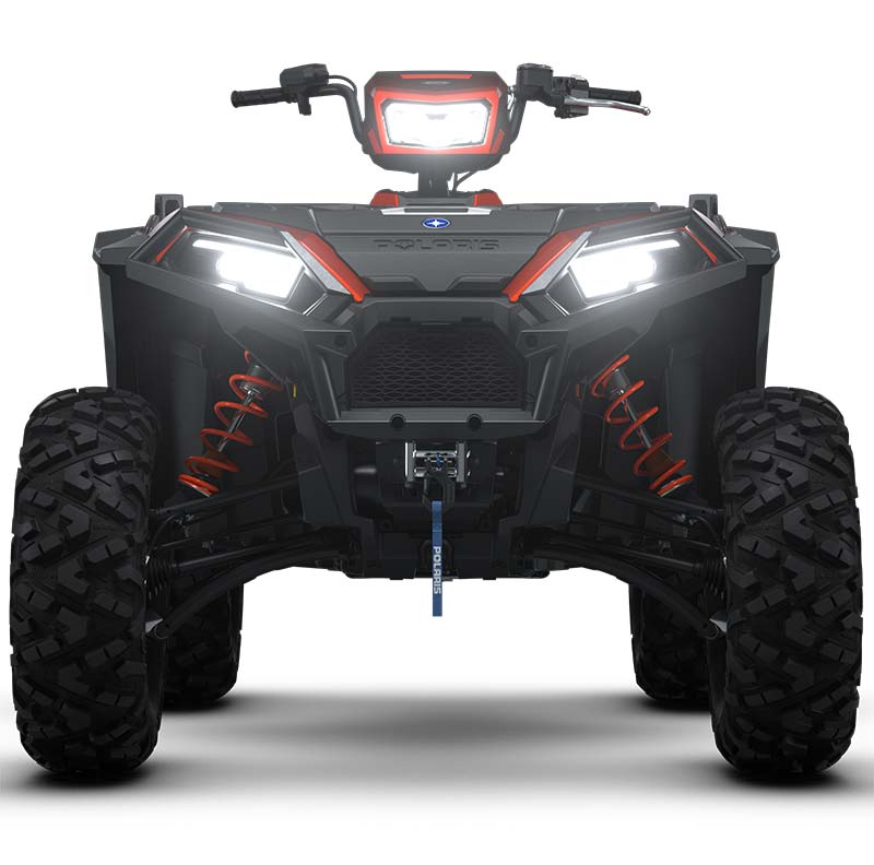 - Puerto de Carga de 12V, Puerto de Carga Lenta en Manillar, Sistema de Seguridad Activado con PIN (P.A.S.S), Winch de 3,500 lb con Cuerda Sintética, Defensa Delantera/Trasera, Plásticos Pintados, Guardabarros, 6 Puntos de Amarre Móviles